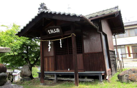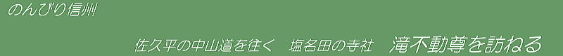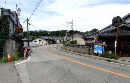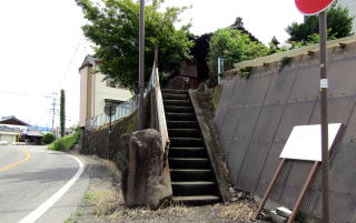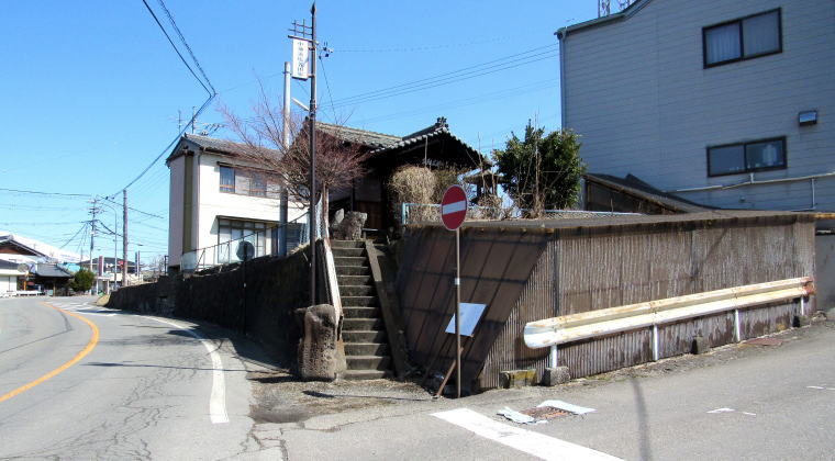 佐久平は浅間山中腹から広がる巨大な複合扇状地で、塩名田から岩村田を経て追分を結ぶ段丘崖が扇端をなしています。したがって、その地帯に湧水や沢川の水源が集中しています。 ![]() ▲河原宿の東端、段丘崖の下に中山道「お滝通り」の記念碑がある ![]() ▲あずまやの北脇に立つ十九夜塔と道祖神。背後には貯水槽。 ![]() ▲不動尊の直下の道路。このカーヴの先に中津橋がある。 ![]() ▲石段をのぼって不動尊堂の向拝の前にいたる ![]() ▲扶桑村道の正面: 切妻破風が向拝となっている ![]() ▲狭い前庭には石仏・石神・石灯籠が並んでいる ![]() ▲背後から不動尊堂を眺める。明神社の社殿はないようだ。 ![]() ▲石段の手前に御代田真楽寺への参詣道起点の道標がある |