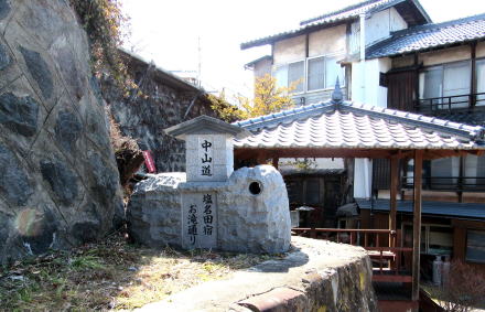 ◆不動尊・明神社は滝がご神体だった◆ 河原宿と中宿の間に横たわる河岸段丘崖の地形は、明治期の新街道令やその後の道路改造、さらに昭和初期の国道と中津橋梁の建設ですっかり変わってしまいました。 ◆滝は憩いの場、祈りの場だった◆ 崖下の水場は中山道を往く旅人の喉を潤しただけでなく、近隣の人びとの憩いの場でもあり祈りの場でもあったようです。滝跡の脇には十九夜塔と道祖神碑が建てられています。 ◆大きく改造された地形◆ 明治政府は1873年の新街道令で中山道を一級街道(後の「国道」扱い)として、桝形の撤去や屈曲や起伏の修正のための経路の変更・改造などを義務づけました。明治25~26年(1892~93年)、千曲川には木造の平橋として中津橋が建設され、中山道は河原宿を抜ける経路から中津橋に接続する道路に改造されました。 |