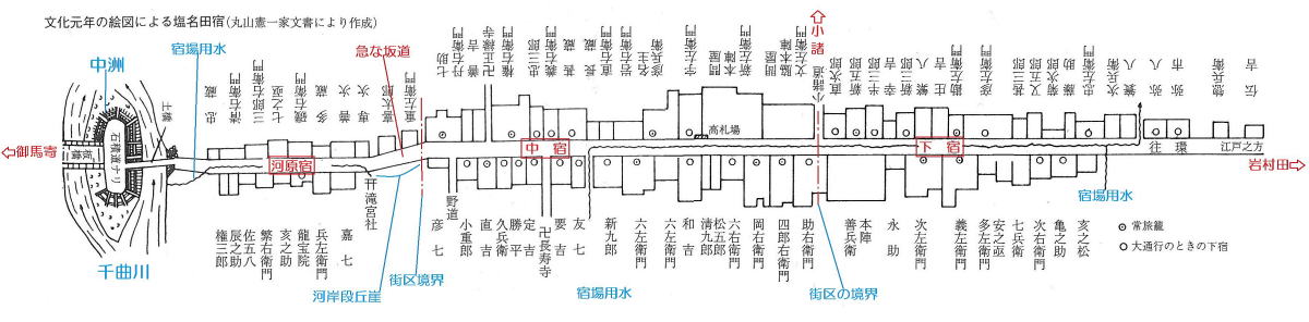 上の絵図は、江戸時代の塩名田宿の宿場の形と町割りを描いたものです。『浅科村史』第4巻 371−373ページの町割り図をもとに編集加工して作成しました。