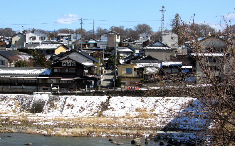 小屋がけの茶屋では間に合わなくなり、長時間の滞留に備えた常設の町家の休憩所や宿、食事処が必要になったはずです。しかも、塩名田の河岸は景勝地で、千曲川河畔の崖地形や森、蓼科山や浅間山の遠望などを楽しめました。ゆっくり休憩しながら川魚料理を楽しもうという旅人もいたかもしれません。