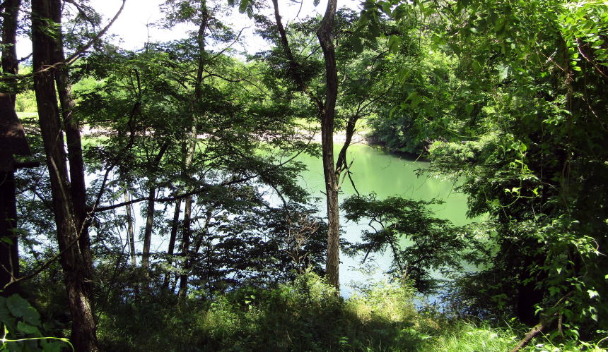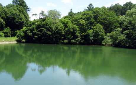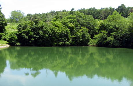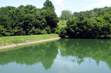 県道は濁池の南側の畔を往くのですが、道路と池の間の斜面には樹林があるため、路肩の下に池があることになかなか気がつきません。ここは、茂田井と望月とのあいだに横たわる丘陵の北麓谷間の窪地で、灌漑用水を得るために、谷間に堰堤を築いて沢水を蓄えた池です。池の周囲はおよそ300メートルほどです。