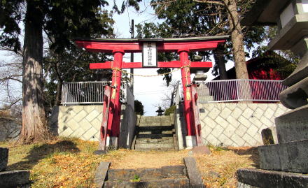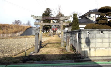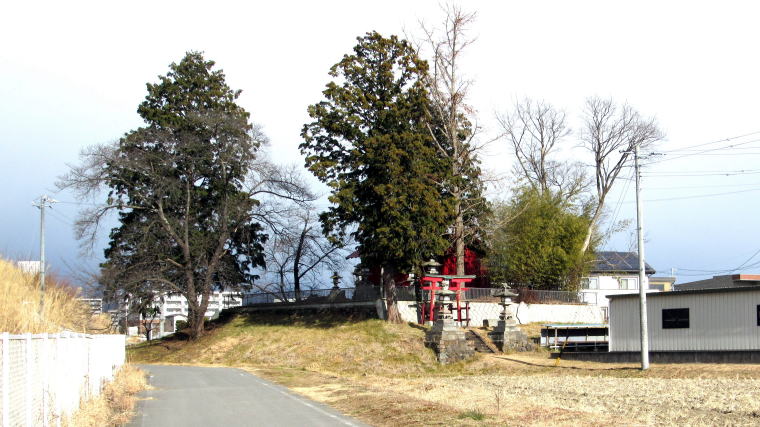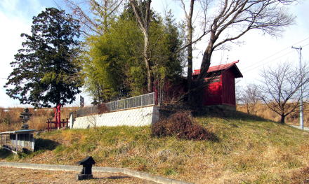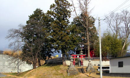 ![]() 太古に泥流がつくった小丘上を境内としている荘山稲荷社。左側に迫る土手は中部横断道路の擁壁。 |