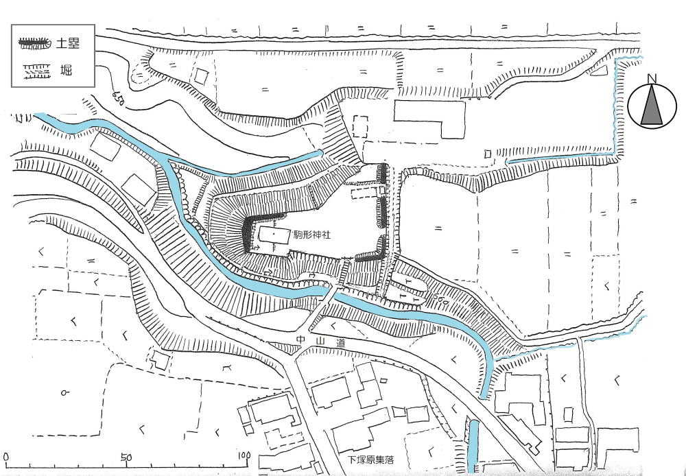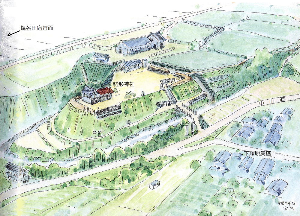 宮坂氏が指摘するように、駒形神社の南川を流れ下る濁川の下流――北西側に700メートル離れた場所――には、大井氏の初期の館と砦の跡があるので、ここは大井氏の城砦群の一環だったと見られます。