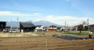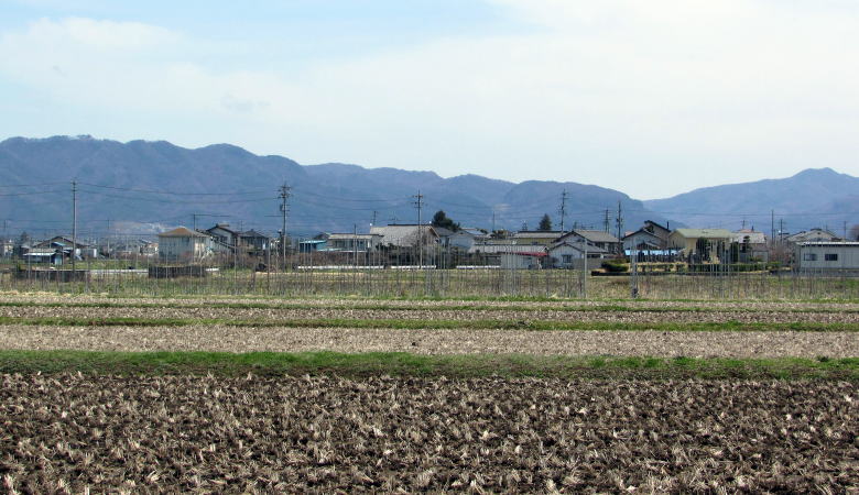 ![]() 下塚原の集落: 南北に長い長方形に整備された水田圃場に囲まれた集落。背景は御牧原の高原台地。 |