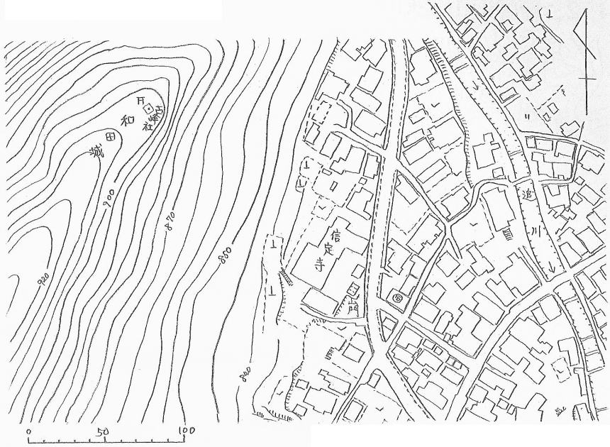 さて、信定寺を含む山麓一帯は、和田大井氏の居館と家臣団の屋敷集落があった場所だと見られています。現在は、和田下町という街区になっています。その当時は、和田郷の主な集落は下町や仮宿、橋場、久保にあったと見られます。