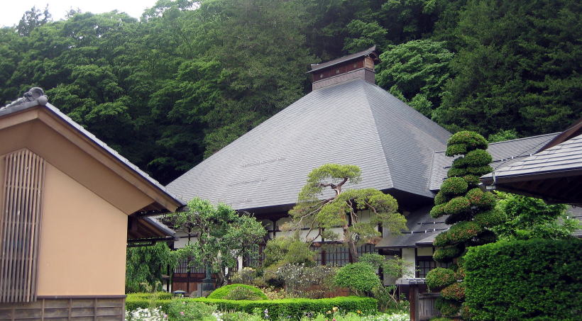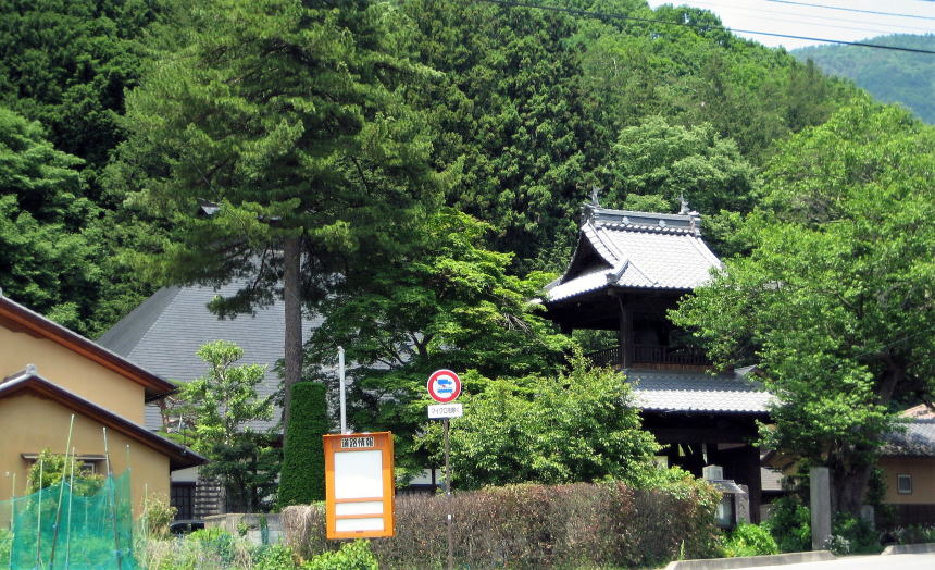 ▲山麓の信定寺本堂と鐘楼門: 言い伝えでは、この辺りに和田大井氏の領主居館があったという