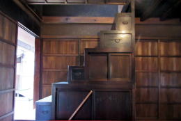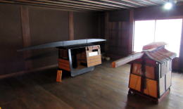▲二階には、漆塗りの高級なものから庶民が乗るものまで4種類の駕籠が置かれている