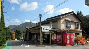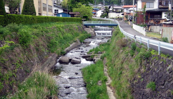 右の写真は、強固に護岸工事された追川の現在の様子を示しています。でも、往時、街道が谷間を川の水面近くまで下っていたことを確認できます。