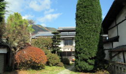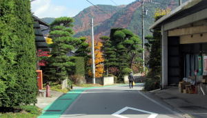 その緩やかな傾斜と街道の緩やかな曲がり具合が街歩きに独特の面白さを加えてくれます。家並みと庭園の木々が奥の方に向かって道なりに小さくなって、快い奥行き感というか距離感をもたらします。