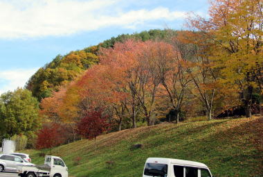 私としては、山すその晩秋の風景を楽しむことにしました。道路沿いの並木の葉が紅くあるいは黄色く変化しているところに、晩秋にしては強い陽射しを浴びて輝いています。