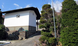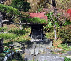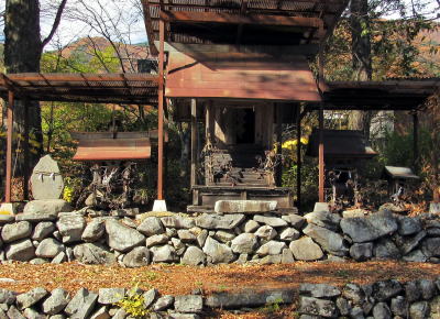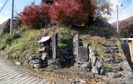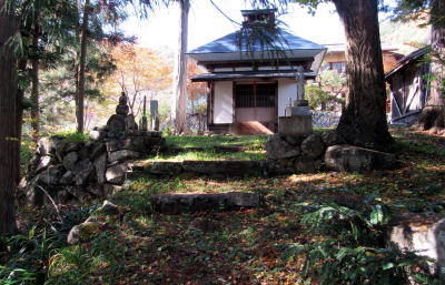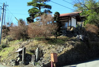 しばらく歩いて、急傾斜の小径に沿って沢が流れ下る辻に来ました。その山側の角には、近隣では「羽田一族のお堂」と呼ばれる祠や石塔、お堂がありました。すぐ近くに羽田氏の居宅があるそうです。