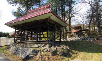 さて、散歩をしていた老婦人に聞いたところでは、文殊堂の上に神社があるということなので、行ってみました。坂道を登り切った辺りの道の東側の草原に神楽殿と社殿がありました。