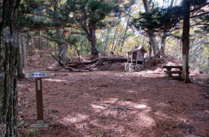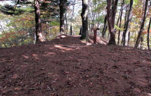 石尊神社脇の木道階段を昇ると、20~30畳ほどの広さの砦跡に出ます。城砦のために尾根を削って造成された平坦な場所です。