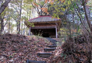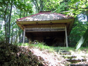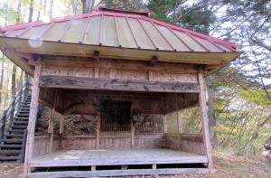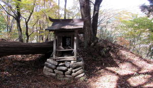 この曲輪の北西端には木製の祠(小さな社殿)がありますが、祭神は不明です。砦の守護神として古くからあったのかもしれません。