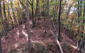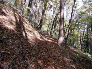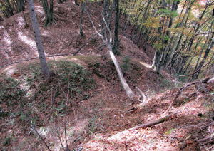 ここは城砦の端で、城砦の防御施設はここから尾根の奥まで少なくとも3キロメートルは断続します。というのは、この尾根に野々入川の谷間から容易に登れる地形となっているからです。尾根上の城砦に攻め上る敵を防ぐためには、稜線上に断続する防備が必要だったのです。