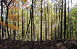 杉林を抜けるとカラマツ林、その先にはコナラなどの落葉樹林が山を覆っています。