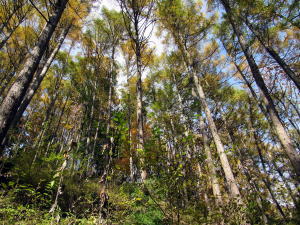 というように、ここは「兵どもが夢のあと」なのですが、険しい尾根上の城跡は美しい山林に取り巻かれています。ことに晩秋のカラマツ林は秀逸で、金色に輝く針状の葉が小さく羽ばたきながら舞い落ちていきます【写真下】。
