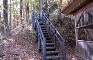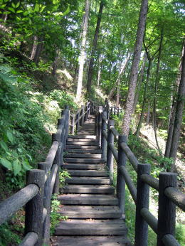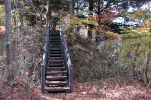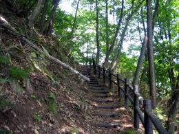社殿の脇には上の曲輪に昇る木道階段が設置されています。和田城址遺構にいたるコースがあるのです。