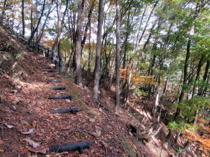 熊野神社から石尊神社まではおよそ600メートルほどの急斜面を上下する狭い険路を歩かなければなりません。ここを歩くなら、やはり登山靴が安全です。