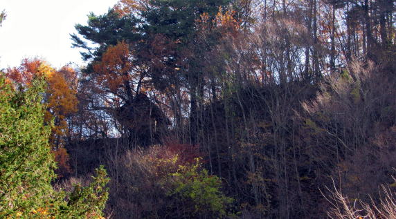 ▲曲輪の南東側には美しい晩秋のカラマツ林
