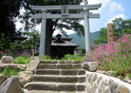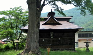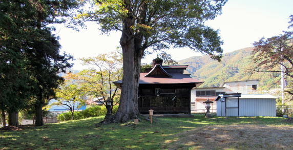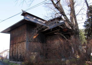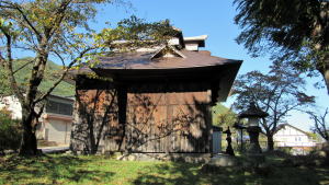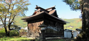 ▲新田の中山道の曲がり角脇にある八幡社。現在の屋根は金属板で葺かれている。