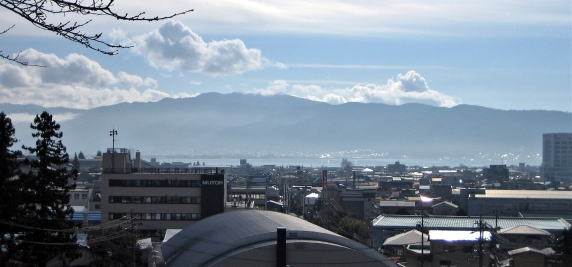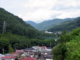 国道142号と重なる旧中山道は、慈雲寺を過ぎて間もなく毒沢温泉を見おろすようになります。北には幾重にも重なる山並みが控えています。