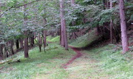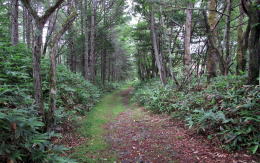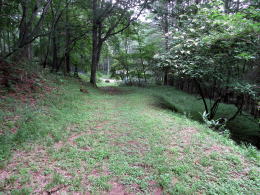東餅茶屋跡から800メートルほど進むと広原の一里塚。小径の脇に差し渡し10メートルほどの塚(土盛りの小山)があります。山林のなかでこういう人の手による構築物を見るとひと安堵します。