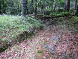 ところで、茅葺家屋脇にある巡査の殉職慰霊碑の脇には、石で縁取りされた沢または小径の遺構が残されています。私として、ここは斜度がきついので、石で土止めをした街道跡ではないかと思います。
