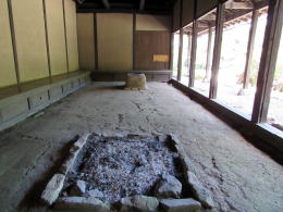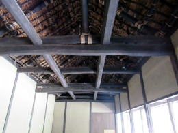 ▲煤けた梁。天井の茅材は、煤がついていないので、近年葺き替えたもののようだ。