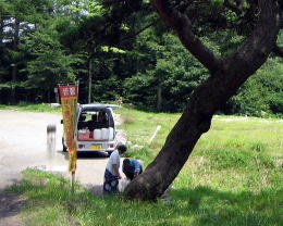 広場の西の隅には、大きなアカマツがあって、その下に清水(水汲み施設)があります。この清水の水質の良さは一帯の人びとにはよく知られていて、ペットポトルやポリタンクを携行して水を汲みにきます。