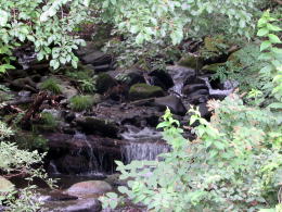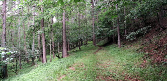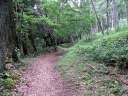 まもなく、沢の音が聞こえるようになります。街道は谷底の少し上に通っています。ここら辺からの下り坂の小径を念仏坂と呼ぶそうです。