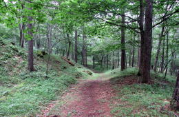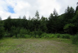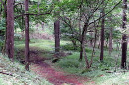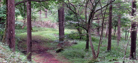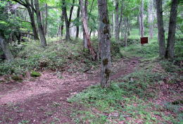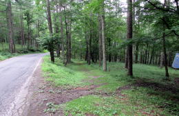 広場の北東の端に、国道142号から分かれて山林に入っていく小径の入り口があります。周囲はカラマツ林に覆われています。峠山頂付近よりも森が明るくなった感じです――時間帯のせいかもしれませんが。
