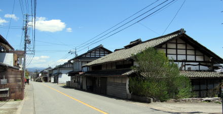 やがて、布瀬川北岸の山麓からだいたい500メートルほど南側のうず高い丘の背――布瀬川の自然堤防上――に、塩名田の渡しから御馬寄村の中ほどを通り百沢に向かう、よりまっすぐな道が建設され、これが江戸幕府の道中奉行が直轄する中山道になりました。泥濘をできるだけ短距離で抜けるためです。そして、山麓にあった桑山村、蓬田村と布瀬川の南にあった八幡村の住民はこの新たな街道沿いに移転させられ、宿場街が建設されました。この宿駅は新たに形成された町なので「新町⇒荒町」と呼ばれました。