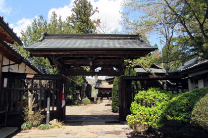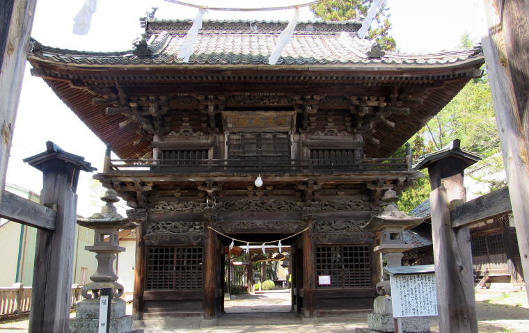 ![]() 天保年間に建立された楼門造りの随神門:重厚な結構で彫刻もじつにみごとだ。 |