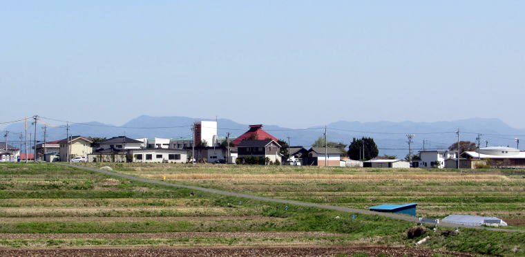 ![]() 八幡宿から南東方向に赤い寺院の屋根が見える。この寺が長念寺だ。 |
