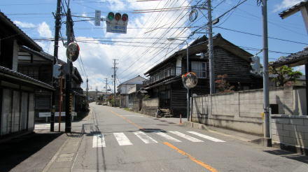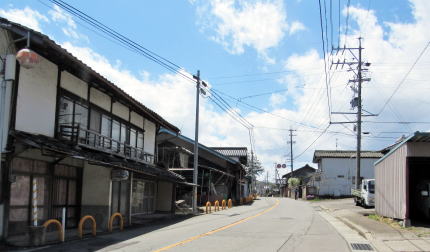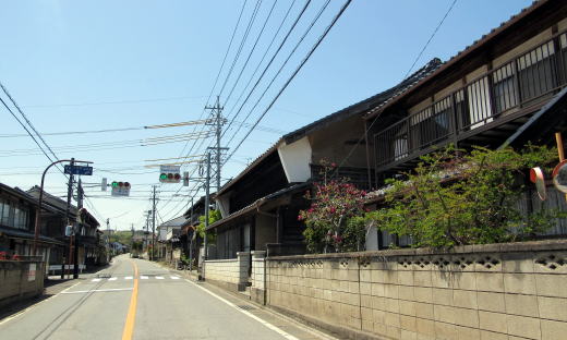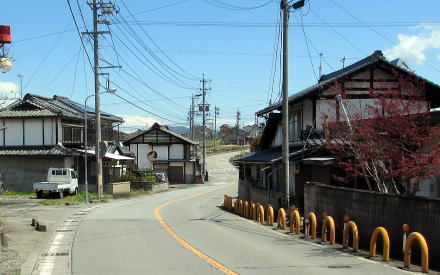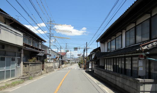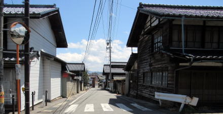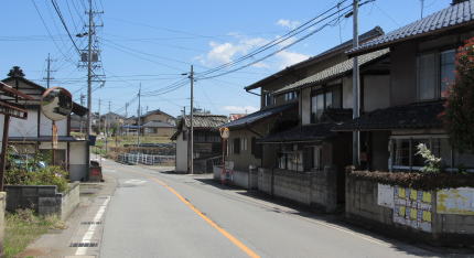 現在の八幡の街並みは、旧街道沿いに約900メートルの長さで、家屋が集まっている家並みの奥行きは旧街道から南北にそれぞれだいたい50メートルくらいで、幅100メートルほどの帯状の形です。帯の外側には水田地帯が広がっています。