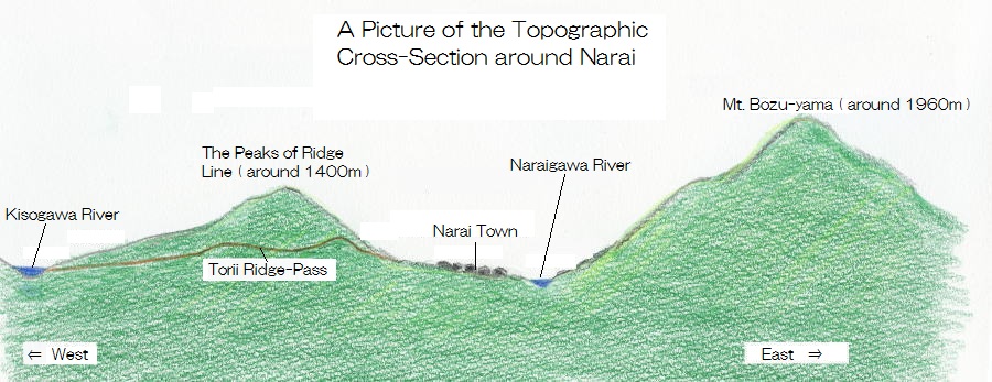 In the old days the road, after leaving Shiojiri, was blocked by steep ridges of mountains in the northwest of Narai.
