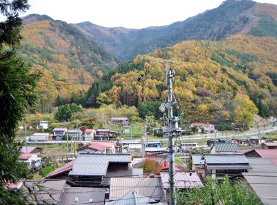 秋の終わりの山に抱かれて、上町の町筋が鍵の手の辻まで見える。何とも心惹かれる家並み風景ではないか。