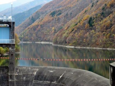 中央奥、堰堤の上に見えるのは鳥居峠。