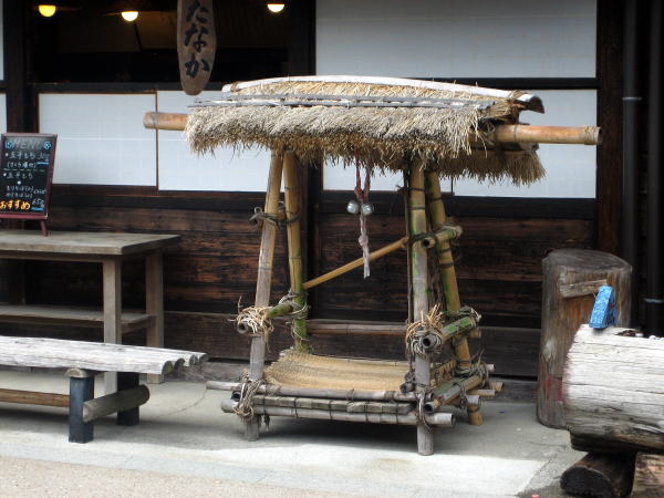 上の写真は、奈良井宿のある店の前に置いてある昔の道中籠です。