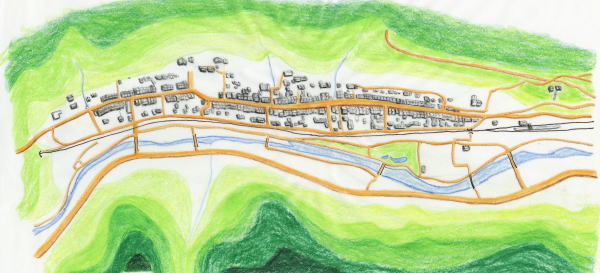 上の絵図は、奈良井宿の街筋と周囲の地形を描いたものです。