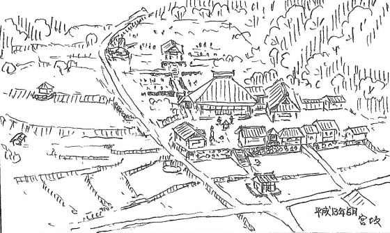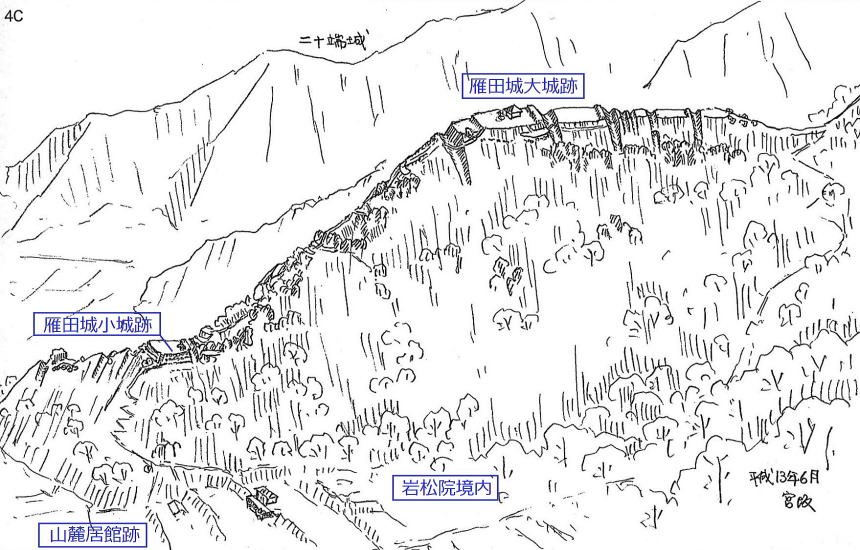 ▲雁田城の鳥観図 出典:宮坂武男『縄張図・断面図・鳥観図で見る 信濃の山城と館』4(2012年)