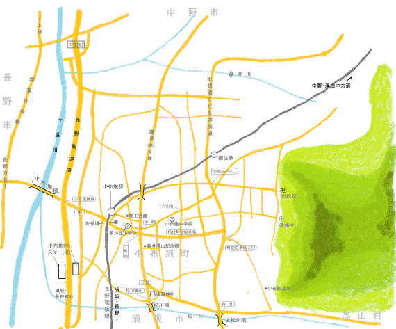地図で見ておおざっぱに言うと、小布施町は、南を松川で仕切られ、東を雁田山の峰と尾根で区切られ、北を篠井川で境界づけられ、西を千曲川の河川敷で囲まれた町だ。
