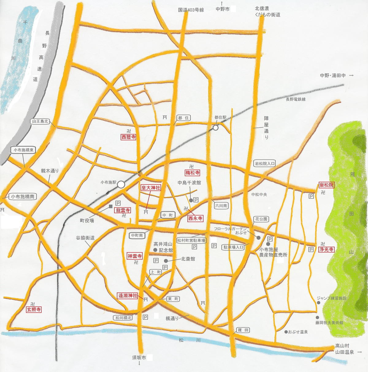 寺や社のなかには、その歴史や由緒・来歴を説明する案内板などを設置してあるところがあって、寺院や神社の由緒とともに小布施町の歴史や伝統も学ぶことができる。 主な寺院や神社をめぐってみよう。