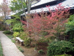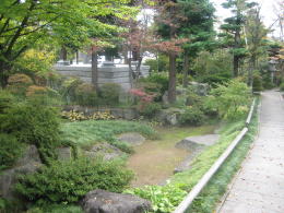 住宅風の庫裏と道路のあいだの狭い庭園。