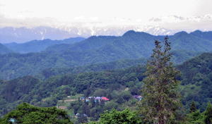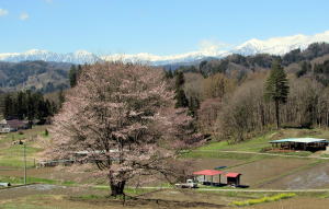 高府から尾根をのぼると、大洞高原までは谷間の集落と田園風景を見渡すことになります。棚田や果樹園、菜園が連なり、ところどころに山桜が植えられています。
