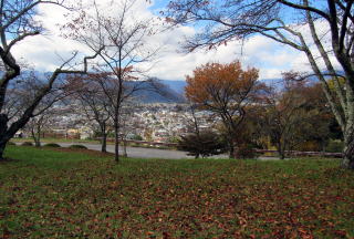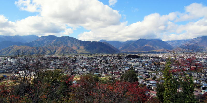 大町公園は鷹狩山山麓の高台にある小さな緑地公園で桜の名所です。この高台から一望する大町市街の風景は雄大このうえないものです。なにしろ市街地の背後に北アルプスの巨大な山並みが迫っているのですから。春には、残雪のアルプスを背景に咲く桜を見ようとする花見客でにぎわいます。