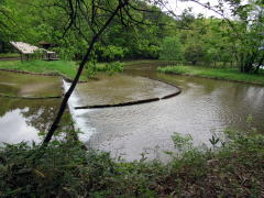 アルプスから流れ来る冷たい川水を、幅広で浅く、くねるように蛇行する水路が森のなかを流れています。 |