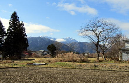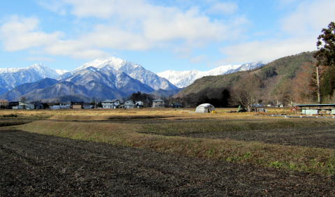 ▲金山神社の南側の水田地帯: 蓮華岳の鋭い尾根が迫ってくる