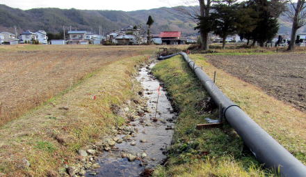 昭和後期(1980年代以降)の圃場整備にさいしては、用水路の周りの伝統的な自然景観(植生)や地形を保全しようという構想がはたらいたものと考えられます。